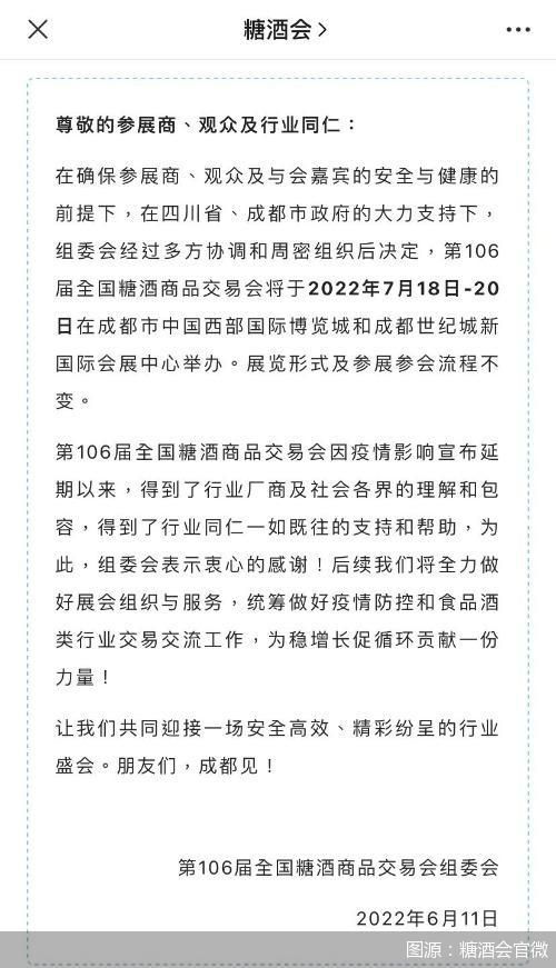 6月11日,北京商报记者通过糖酒会官网公众号了解到,第106届全国糖酒商品交易会将于2022年7月18日-20日在成都市中国西部国际博览城和成都世纪城新国际会展中心举办。(记者 赵述评 翟枫瑞)