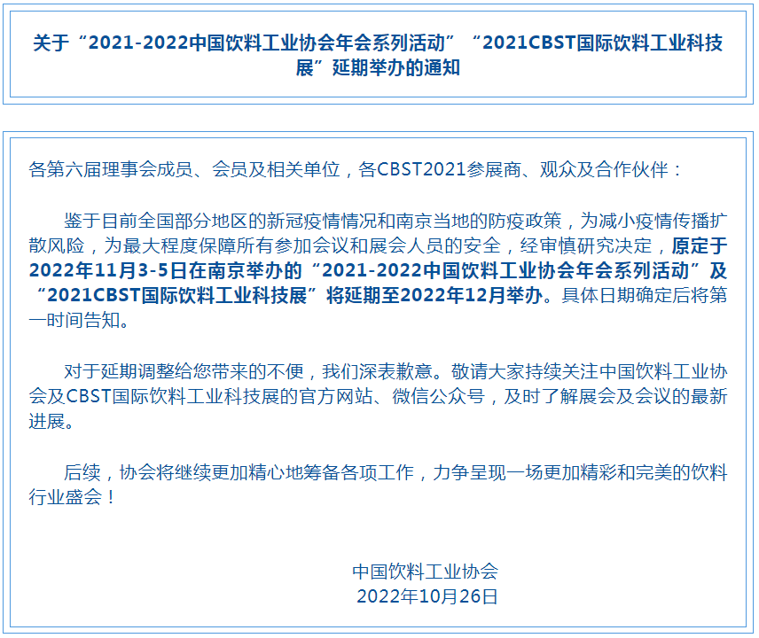 “2021-2022中国饮料工业协会年会系列活动”“2021CBST国际饮料工业科技展”延期举办