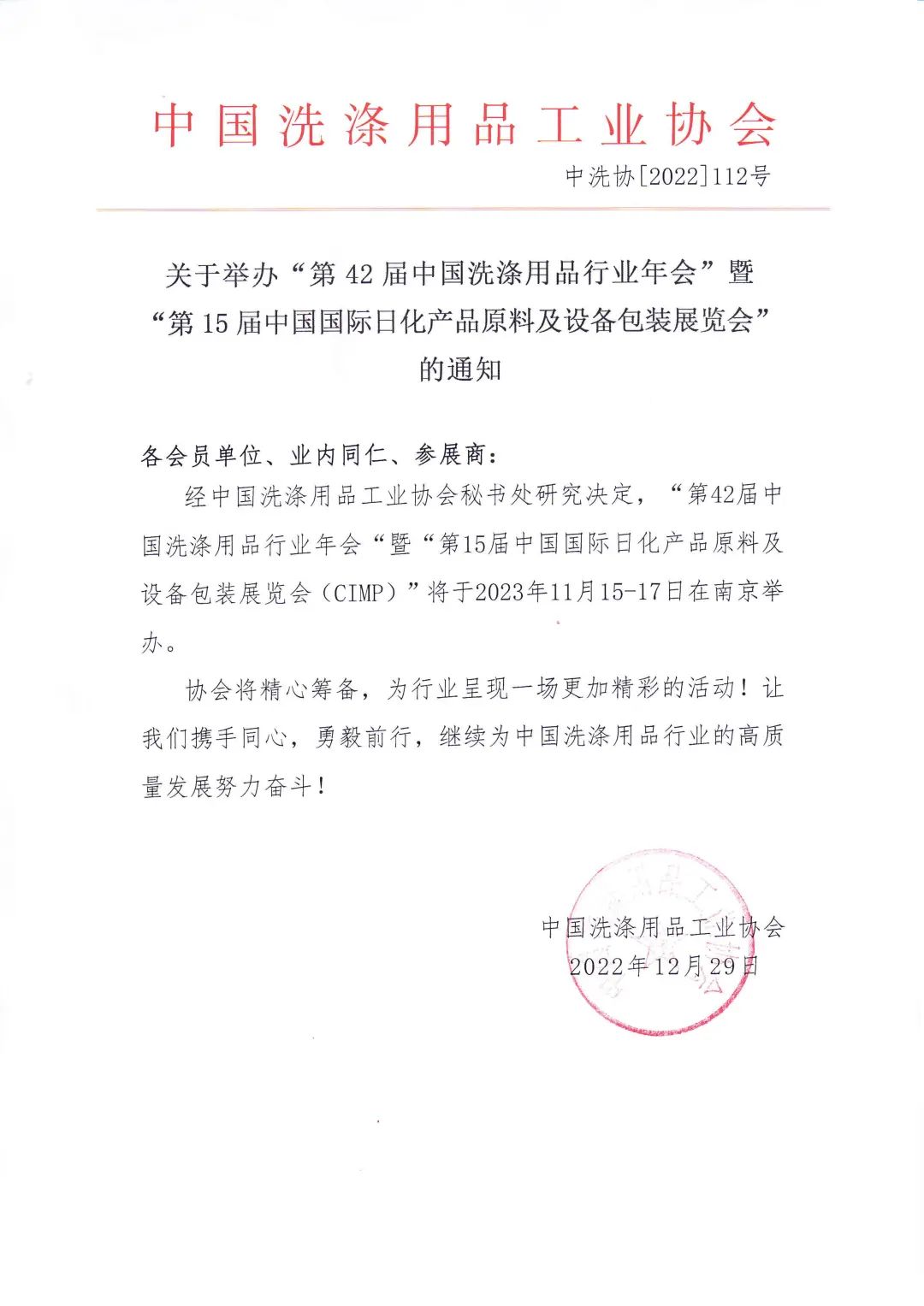 关于举办“第42届中国洗涤用品行业年会”暨“第15届中国国际日化产品原料及设备包装展览会”的通知