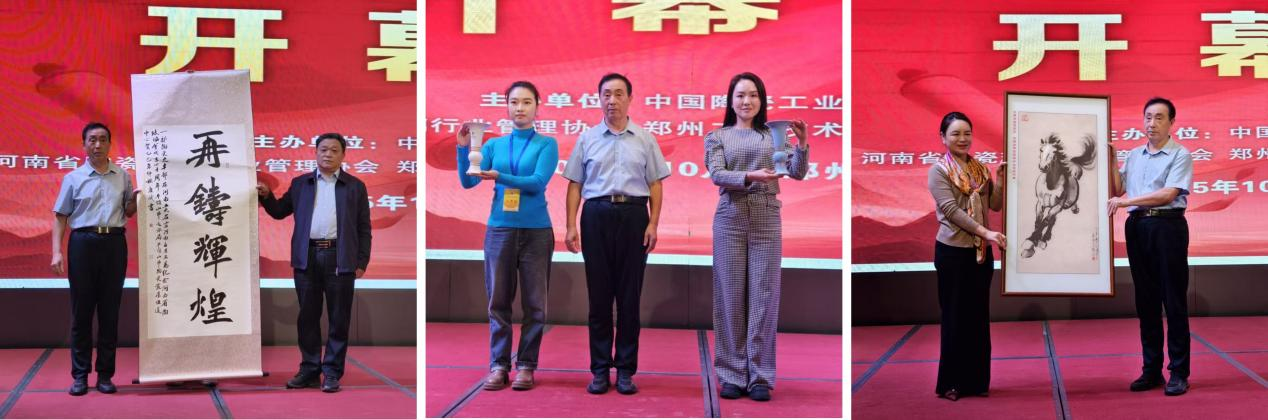 会上,为庆贺省陶瓷玻璃行业发展四十周年成果展硕果累累,平顶山市文旅局、平顶山陶瓷发展促进中心赠书法“再铸辉煌”一幅;宝丰中汝廷怀窑李廷怀捐献“双奥尊”一对;宝丰大博瓷画捐献“悲鸿马”瓷画一幅,祝福河南省陶瓷玻璃行业管理协会未来再创新辉煌。