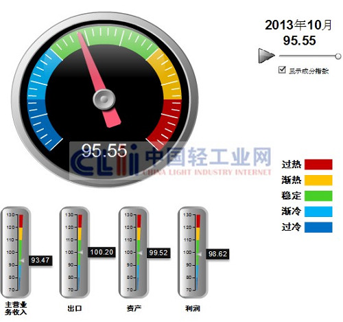 发布2013年10月中轻日化景气指数。10月,中轻日化景气指数95.55,其中:主营业务收入景气指数为93.47,出口景气指数为100.20,资产景气指数为98.52,利润景气指数为98.62(图1)。