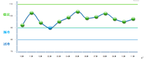 2013年11月,食品行业利润景气指数继续运行在绿色稳定区间。