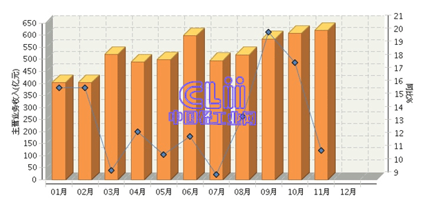 1~11月,家具行业规模以上企业(下同)的累计主营业务收入同比增长13.59%,仅占轻工全行业累计主营业务收入的3.16%。从月度主营业务收入走势来看,11月继续攀升,然而增速却进一步放缓为11.22%,比10月下降了6.78个百分点,下降幅度扩大(图2和图3)。