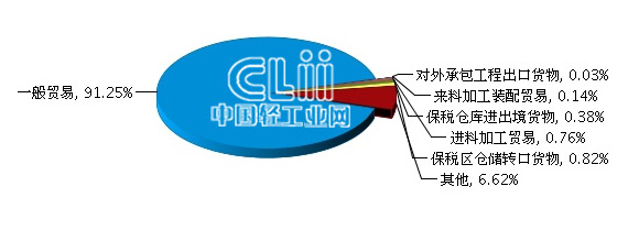 从贸易方式看,以一般贸易为主,一般贸易完成累计出口额10.44亿美元,占全部出口总额的91.25%,同比增长64.2%。