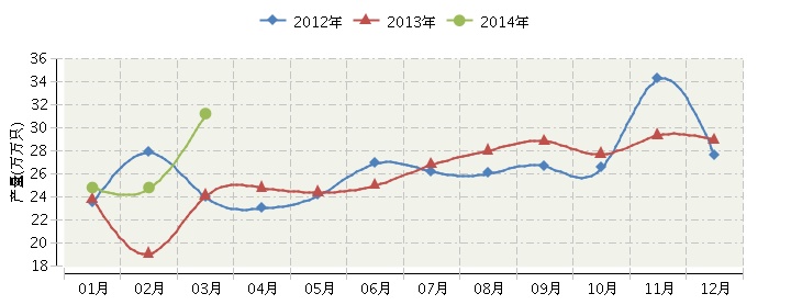 根据国家统计局公布数据, 2014年1~3月,全国原电池及原电池组(折R20标准只)行业累计完成产量81.19亿只,同比增长4.68%。其中: 3月份完成产量31.22亿只,同比增长9.47%。2014年全国原电池及原电池组行业连续三年月度产量对比如下图所示。