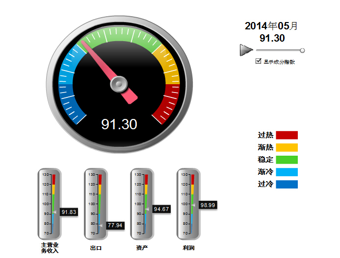 2014年5月份中轻饮料景气指数为91.30,比4月份下降了0.18个百分点。饮料景气指数仍处于绿色稳定区间,呈平稳运行走势。具体的分项指数为:收入景气指数92.83、利润景气指数98.99。(见图1)