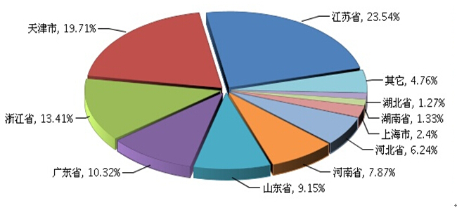 自行车行业生产主要集中在江苏省、天津市、浙江省、广东省、山东省等地区,这5省市的主营业务收入比重占全国的76.13%(参见图3)。