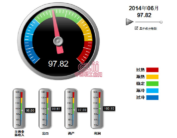 发布2014年6月中轻照明景气指数。6月,中轻照明景气指数97.82,其中:主营业务收入景气指数为96.66,出口景气指数为99.61,资产景气指数为97.69,利润景气指数为100.10(图1)。