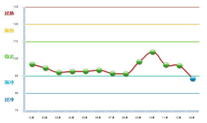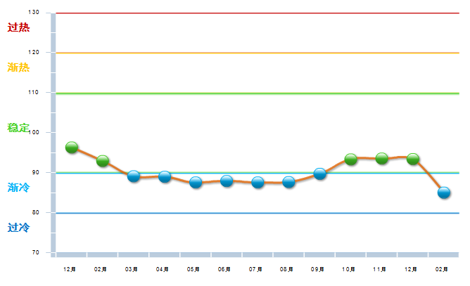 2013年12月至2014年8月中轻工艺美术景气指数处于基本稳定状态。2014年8月份中轻工艺美术景气指数开始出现较大幅度上升,自10月开始出现较大幅度下降,到15年2月已降至渐冷区域。(参见图2)