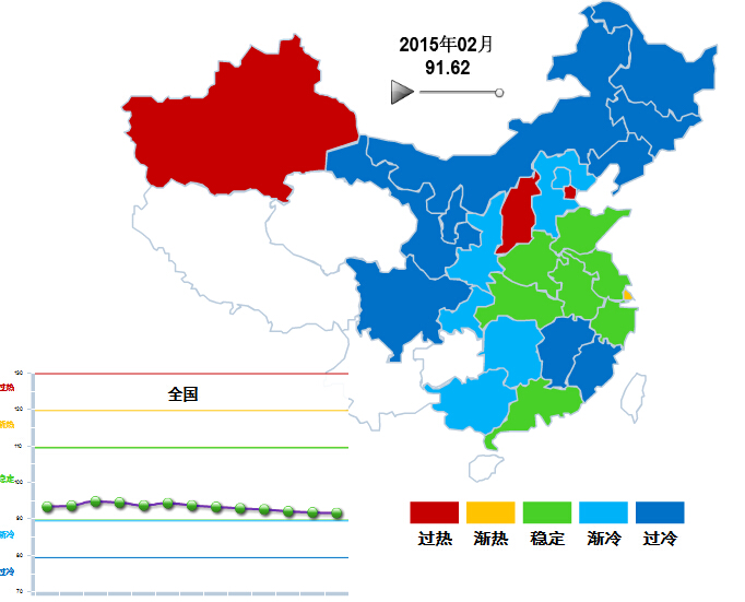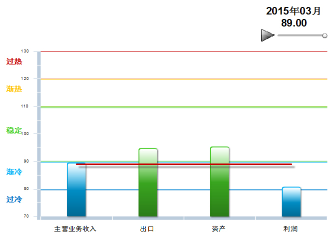 2014年2月至2015年2月,中轻皮革景气指数基本稳定,在90~100间小幅波动,处于稳定提示区的下半区运行。3月中轻皮革景气指数89首次跌入渐冷提示区,预示皮革行业将面临困境(参见图3)。