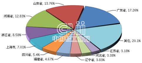 1~11月,家具行业累计利润额居全国前十地区的排名与110月相同,依次是广东、山东、河南、浙江、上海、四川、福建、辽宁、河北及江苏。其中,广东累计实现利润总额(下同)占17.26%,山东占13.76%,河南占12.83%,浙江占8.58%,上海占7.01%,四川占5.40%,福建占4.67%,辽宁占3.83%,河北占3.38%,江苏占3.18%(图6)。