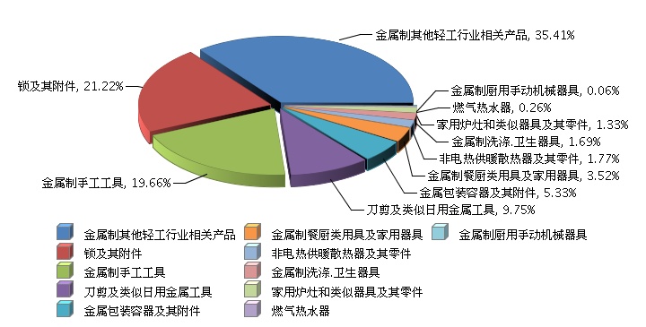 2015年4月,我国五金行业中,锁及其附件、金属制手工工具两行业完成进口额相对占比较高,分别为21.22%和19.66%。燃气热水器、燃气热水器、金属制洗涤.卫生器具、刀剪及类似日用金属工具、家用炉灶和类似器具及其零件、非电热供暖散热器及其零件六个子行业增速实现了正增长,且高于行业平均值。其中热水器行业增速最高,达176.4%;金属制餐厨类用具及家用器具行业增速下降最多,超过了20%。
