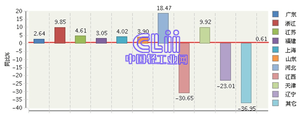 2014年,家具行业累计出口值居前10位的地区依次是广东、浙江、江苏、福建、上海、山东、河北、江西、天津及辽宁,其中,仅广东和浙江2个地区的累计出口值合计占到了全国家具行业出口总值(下称“占比”)的67.44%;上述10个地区中,河北的累计出口值增速(下称“累计增速”)达到了18.47%,天津和浙江的累计增速接近10%,江苏、上海、山东、福建及广东5个地区呈个位数低位增长,而江西和辽宁2个地区表现出了大幅度负增长,分别为-30.65%和-23.01%(图6和图7)。