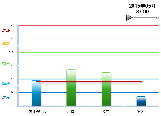 和中国皮革工业协会联合发布2015年5月中轻皮革景气指数。5月份中轻皮革景气指数87.99,较4月的88.65下降0.66个百分点。其中:主营业务收入景气指数为89.02,出口景气指数为96.97,资产景气指数为94.82,利润景气指数为76.91(参见图1、2)。