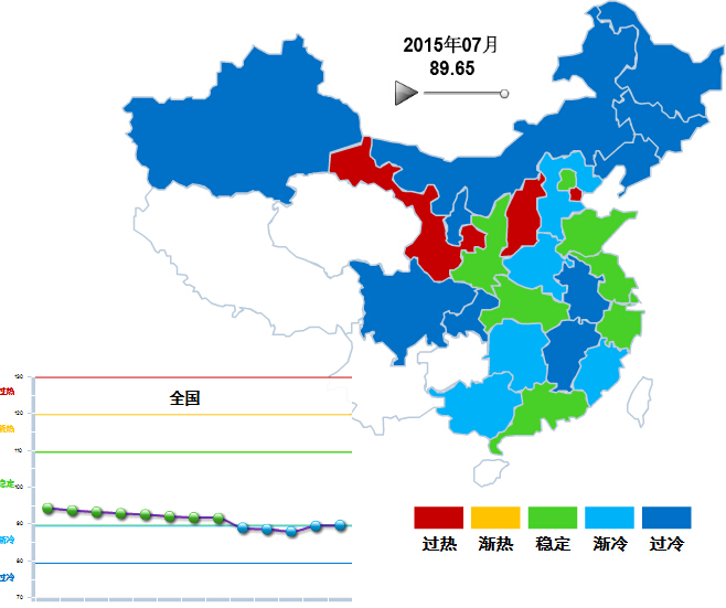 2014年6月至2015年2月,中轻皮革景气指数基本稳定,在90~100间小幅波动,处于稳定提示区的下半区。3月中轻皮革景气指数89首次跌入渐冷提示区, 6、7月虽然运行在渐冷提示区,但呈现企稳回升态势(参见图3)。