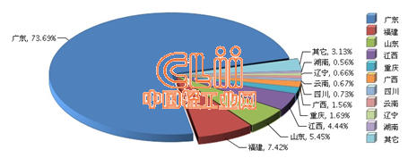 我国陶瓷砖出口额七成以上来自广东。据海关数据显示,2015年1~9月广东陶瓷砖累计出口42.02亿美元(同比增长1.45%),占我国陶瓷砖出口总额的73.69%,详见图1。