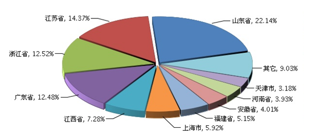 1~10月,文体用品行业累计利润额比重主要集中在山东省、江苏省、浙江省、广东省、江西省、上海市、福建省、安徽省、河南省、天津市等地区。其中:山东省完成累计利润总额占22.14%;江苏省完成累计利润总额占14.37%;浙江省完成累计利润总额占12.52%;广东省完成累计利润总额占12.48%;江西省完成累计利润总额占7.28%。