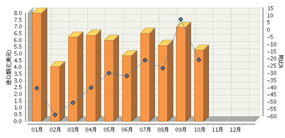 2015年1~10月,全国食品行业累计完成进口额59.78亿美元,同比增长-30.81%。进口额波动较大,下降幅度逐月收窄。其中:1月份完成进口额8亿美元,同比增长-37.05%;2月份完成进口额4.04亿美元,同比增长-55.57%;3月份完成进口额6.23亿美元,同比增长-47.16%;4月份完成进口额6.36亿美元,同比增长-36.62%;5月份完成进口额5.99亿美元,同比增长-26.5%;6月份完成进口额4.85亿美元,同比增长-28.72%;7月份完成进口额6.5亿美元,同比增长-17.65%;8月份完成进口额5.6亿美元,同比增长-23.3%;9月份完成进口额6.93亿美元,同比增长10.72%;10月份完成进口额5.26亿美元,同比增长-17.24%。