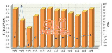 从月度出口额情况看,年初、年末的1、11、12月出口额大幅高于其他月份。其中1月份出口金额10.11亿美元,仅低于12月;2月份出口6.61亿美元,同比增长175.74%,为全年单月最高增速;3月同比下降,当月出口4.14亿美元,为全年单月最低;4~10月出口没有明显改善,大多同比下降,单月出口额维持在6亿元左右,其中7月份出口额同比下降20.87%,为全年单月最高降幅;11、12月出口大幅增长,其中11月同比增长34.13%,仅低于2月份,12月出口10.26亿美元,为全年单月最高值,详见图3。