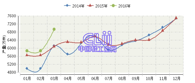根据国家统计局公布数据:2016年1~3月,全国家具行业累计完成产量19151.71万件,同比增长9.09%。其中:3月份家具产量同比增长14.36%。