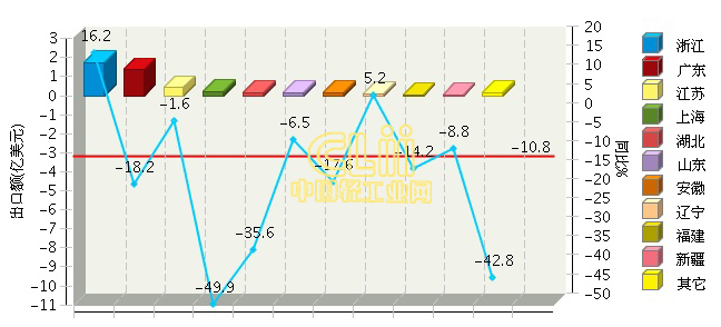 2016年三季度,全国白炽灯泡行业完成累计出口同比增长-10.83%。从出口区域来看,出口额排在前五位的区域是浙江、广东、江苏、上海、湖北。其中:浙江完成累计出口额同比增长16.25%;广东完成累计出口额同比增长-18.21%。