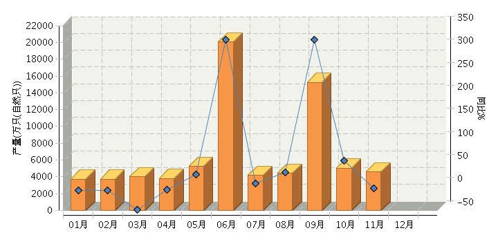 根据国家统计局公布数据,2016年1~11月全国碱性蓄电池行业累计完成产量同比增长54.07%。其中:11月份完成产量同比增长-1.68%。2016年全国碱性蓄电池行业月度产量及同比如下图所示。
