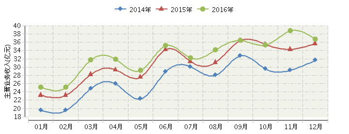 ——主营业务收月度走势:均保持同比增长态势,总体走势好于前两年。2016年1~12月,全国乐器行业累计完成主营业务收入392.33亿元,同比增长7.56%。其中:3月份主营业务收入同比增长14.71%;4月份同比增长11.88%;5月份同比增长9.88%;6月份同比增长4.62%;7月份同比增长5.72%;8月份同比增长12.7%;9月份同比增长3.62%;10月份同比增长1.86%;11月份同比增长7.73%;12月份主营业务收入36.77亿元,同比增长3.67%。