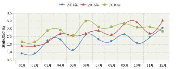 图:2014-2016年全国乐器制造行业连续三年月度利润总额对比