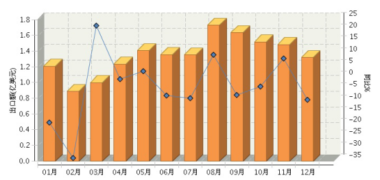 ——出口分析:2016年,全国乐器行业累计出口额15.71亿美元,同比下降7%。在月度出口中:有8个月出口额同比下降,4个月同比增长。其中:1月份出口额1.21亿美元,同比下降18.68%;2月份同比下降33.66%;3月份同比增长22.39%;4月份出口额同比下降0.22%;5月份同比增长3.16%;6月份同比下降7.07%;7月份同比下降8.35%;8月份出口额最高,为1.73亿美元,同比增长10.2%;9月份出口额1.64亿美元,同比下降6.89%;10月份同比下降3.31%;11月份出口额同比增长8.48%;12月份出口额1.32亿美元,同比下降9.05%。