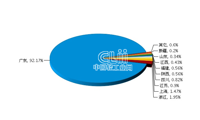 从出口地区来看,比重主要集中在广东、浙江、上海、江苏、四川、陕西等地。其中:广东完成累计出口额1.87亿美元(占92.17%),同比增长49.21%;浙江完成累计出口额0.04亿美元(占1.95%),同比增长-13.48%;