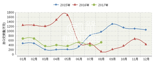 2017年1~8月,辽宁照明灯具制造行业累计完成出口交货值4,163.60万元,同比增长27.39%。其中: 8月份完成出口交货值522.1万元,同比增长308.85%。