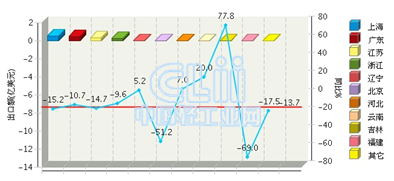 从出口省市来看,上海、广东、江苏、浙江、辽宁是出口额最大的五个区域,其中上海完成累计出口额0.57亿美元(占31.4%),同比增长-15.18%。