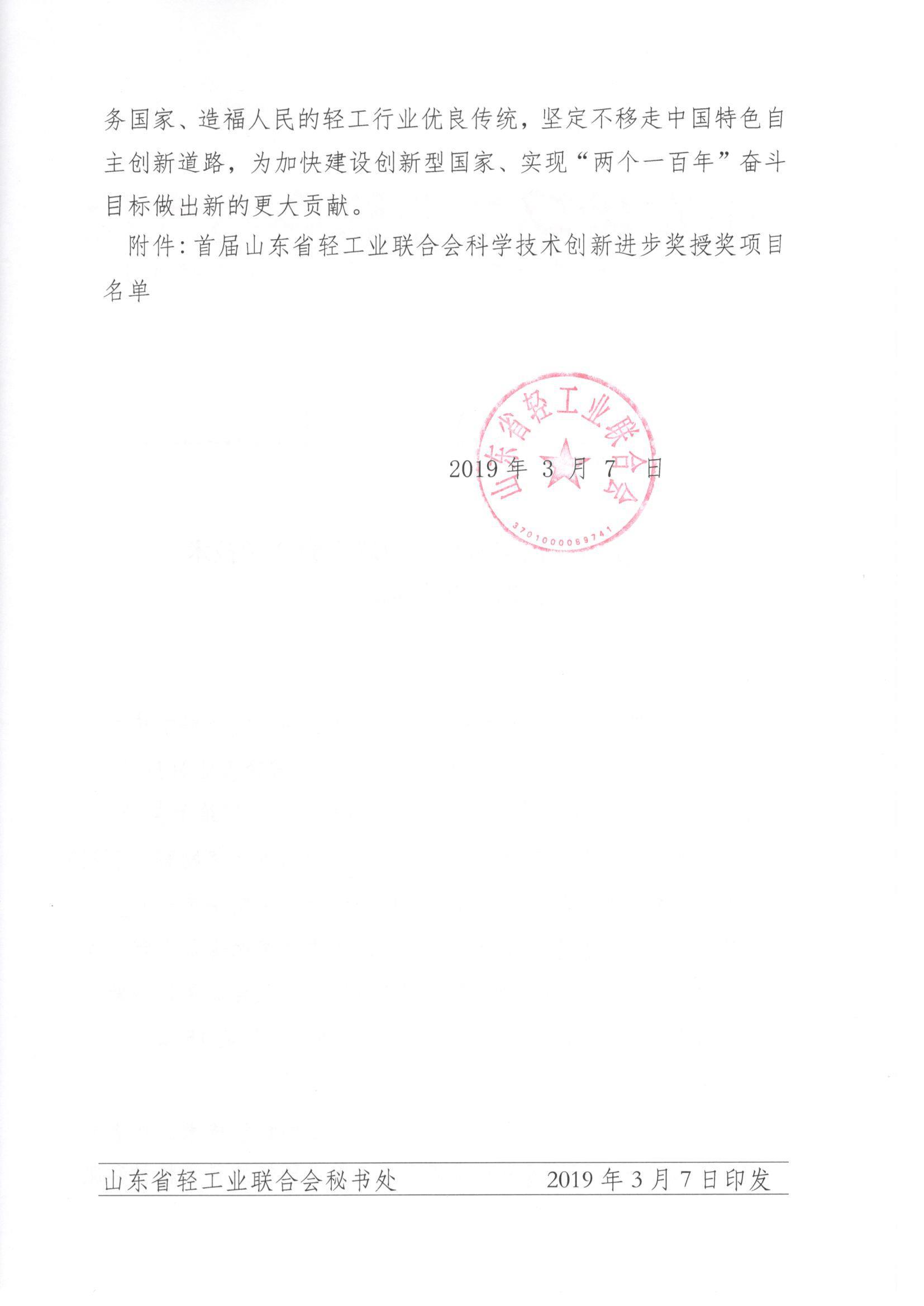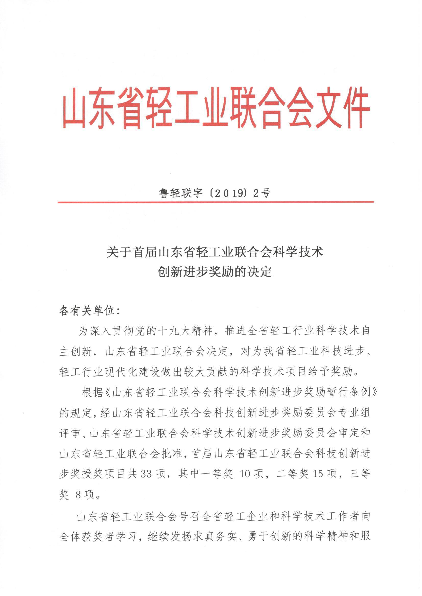关于首届山东省轻工业联合会科学技术创新进步奖励的决定