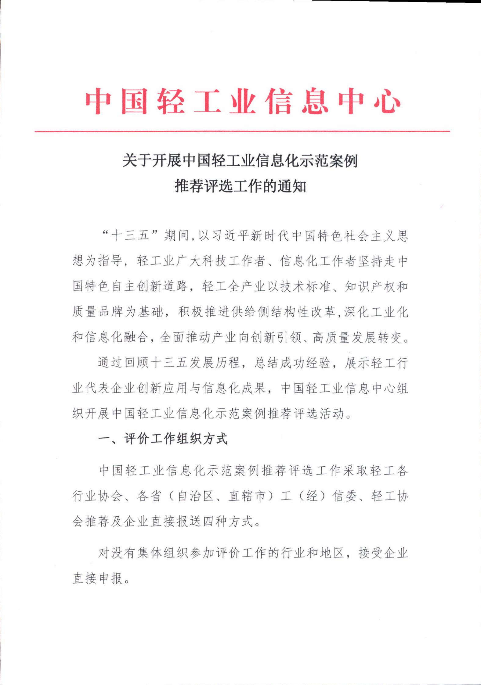 关于开展中国轻工业信息化示范案例推荐评选工作的通知