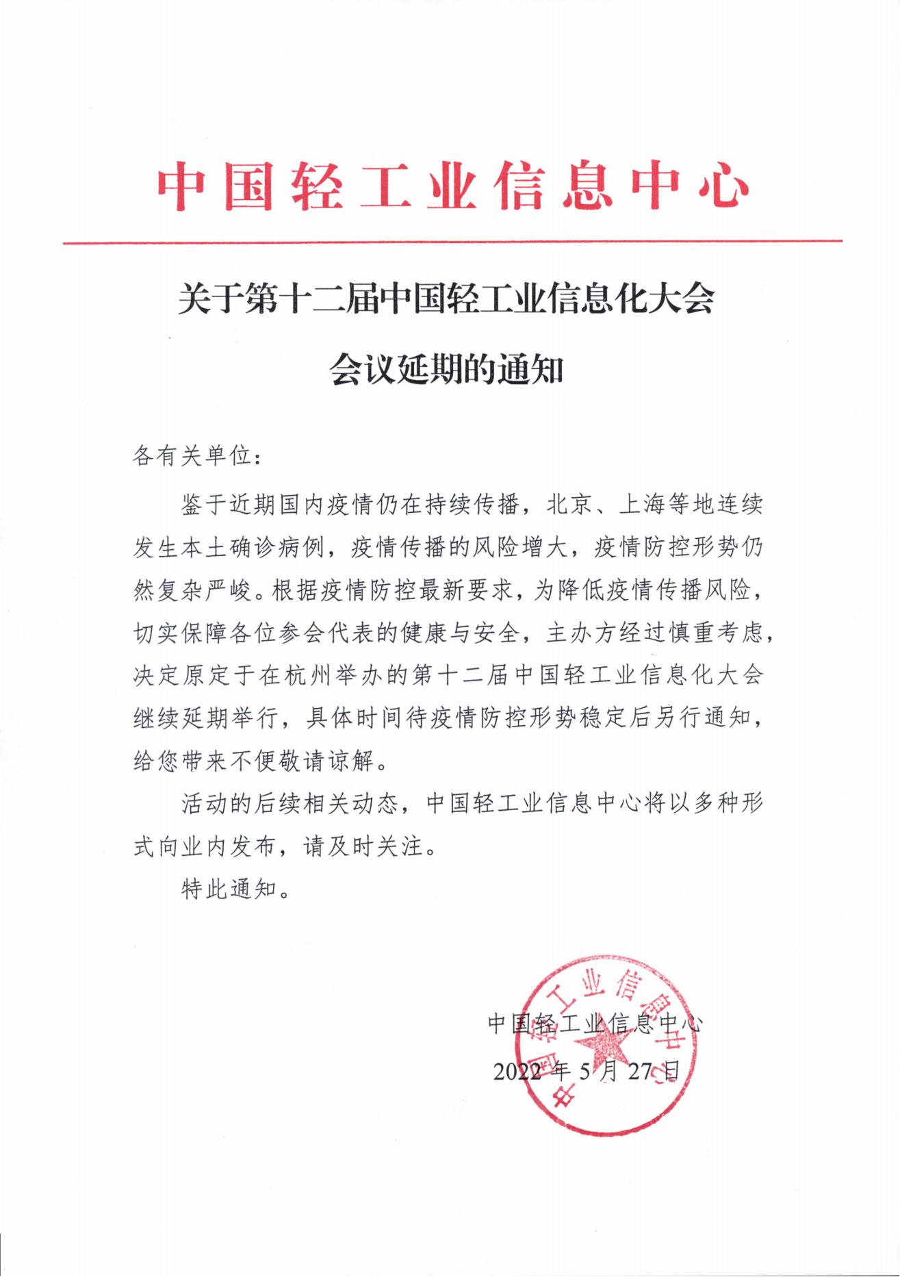 关于第十二届中国轻工业信息化大会会议延期的通知