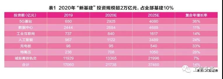 5月份,海通证券公开发布的研报认为,预计2020年新基建投资规模达3万亿元左右,新基建7大领域的投资同比增速均在两位数以上。