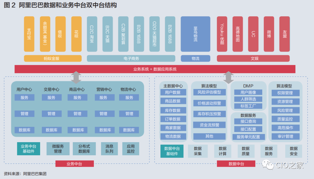 中台战略源于互联网企业,是企业适应数字业务的快速发展和外部竞争环境变化的产物。随着企业规模不断扩大,业务走向多元化发展,2015年12月阿里巴巴启动三年(2015~2018年)的中台战略。当时阿里中台战略的初衷是解决资源浪费和效率低下的问题,其核心是将不同业务线共同用到的数据和技术(软、硬件以及分析技术工具)加以整合、沉淀,成立专门的中台部门,统一支持前台业务需求。中台的形式使得企业可以不用重新设计、开发来自不同部门的新业务需求,从而避免重复功能建设和维护带来的资源浪费,也极大地解决了前台“烟囱林立”、新业务创新、开发效率低下的问题。以强大的中台来支持众多业务线,阿里称其为“大中台,小前台”的中台战略,这成为阿里之后数据和业务中台双中台结构的基础。