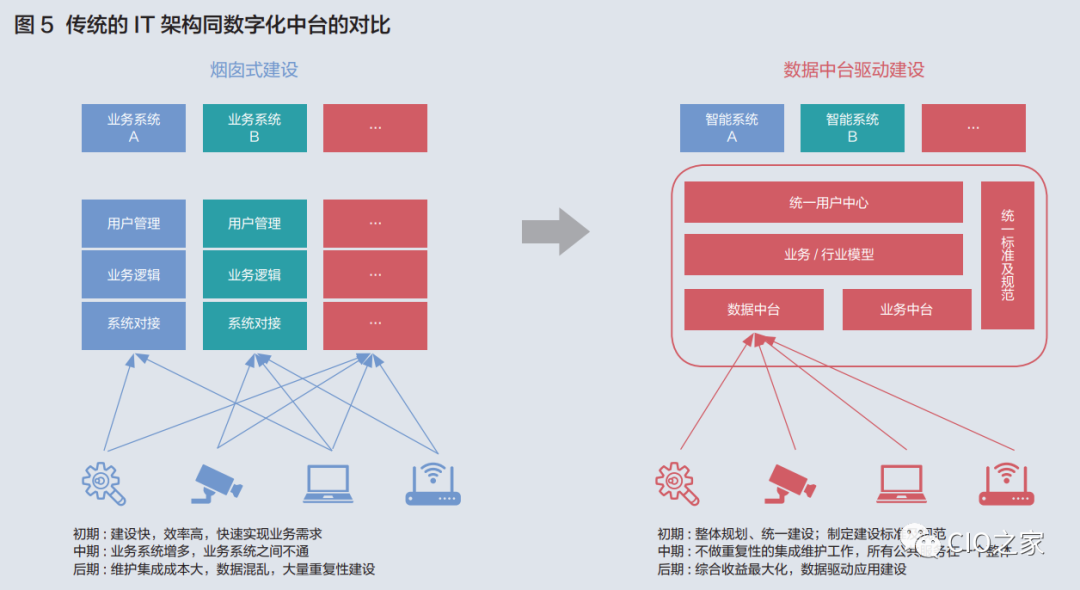 不同于IT信息技术,中台战略以数据技术为核心,以提升客户价值为目的。数字化中台基于共享服务单元和多层次(数据中台、技术中台和业务中台)驱动的架构设计思想,彻底颠覆了企业传统的IT以及组织和业务的纵向架构。同传统的IT架构相比,数字化中台需要更完善的方法论与工具的支撑,同时涉及对业务的高度认同和管理的全面协同(见图5)。
