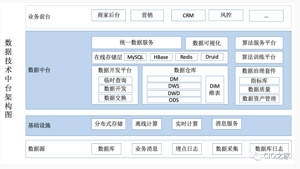 为了解决海量的结构化和非结构化数据的存储、恢复和高效运算,很多企业建立了分布式大数据集群。但大数据集群并不等同于数据中台,大数据集群仅仅是在建立数字化中台底层数据存储和运算时用到的一部分技术架构。数据中台是业务部门代表的前台和技术部门经过资源整合、能力沉淀后形成的。