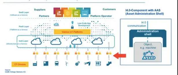 图2是今年德国工业4.0路线图发布的一张系统图,阐述具有资产管理壳的工业4.0基本单元(I4.0-Component with AAS)是实现跨公司OT设备的互操作性基础。由不同的公司制造的OT设备,只要相应建立一个符合工业4.0要求的资产管理壳,将在其全生命周期的各个阶段都可以通过基础架构服务(IaaS)、平台架构服务(PaaS)和软件服务(SaaS)形成跨公司设备的互操作性能力。