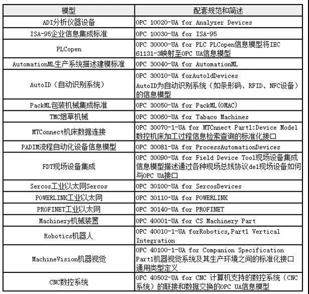 表1 若干OPC UA配套信息模型规范一览表
