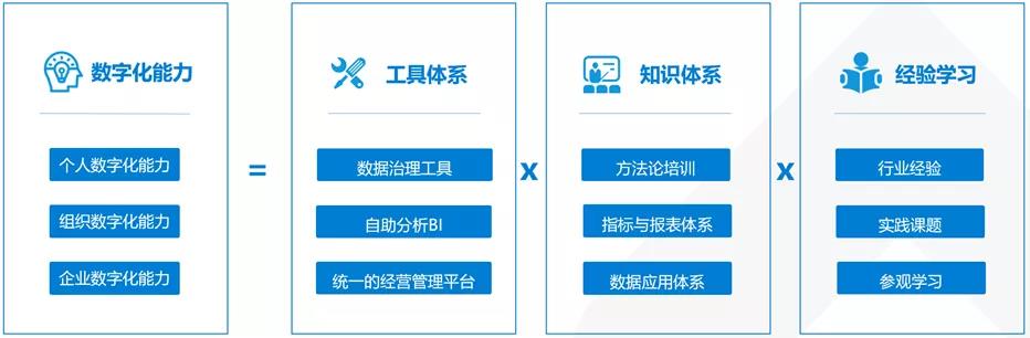 数字化能力建设包含三个方面,工具体系、知识体系和经验学习。知识体系是利用理论知识培养员工认知能力,包括技能培训、管理培训与数字化应用培训。工具体系是员工治理的表现形式之一,也是理论知识用于实践的有效途径,对于数字化经营能力来说,可以利用BI工具搭建统一的数字化经营管理分析平台。经验学习指的是引入外部资源,学习一些行业经验、参观优秀的客户、进行一些实践课题,多方位的提升数字化能力。