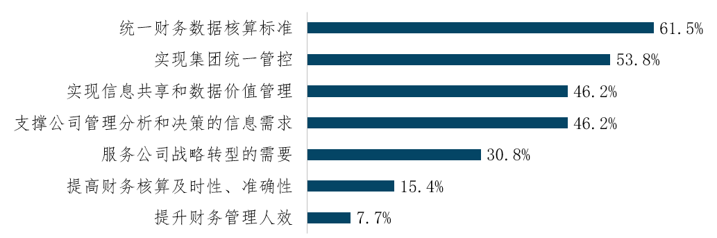 基于上述分析的企业财务数字化转型驱动因素,参评企业财务数字化转型的目标也相应集中于统一财务数据核算标准、实现集团统一管控、实现信息共享和数据价值管理等几个方面。在着眼于财务领域提质增效的同时,近半数的企业也同时将财务数字化转型目标定位在对整个企业的支撑和赋能,包括对财务数据价值的挖掘,对管理及决策的支撑等。