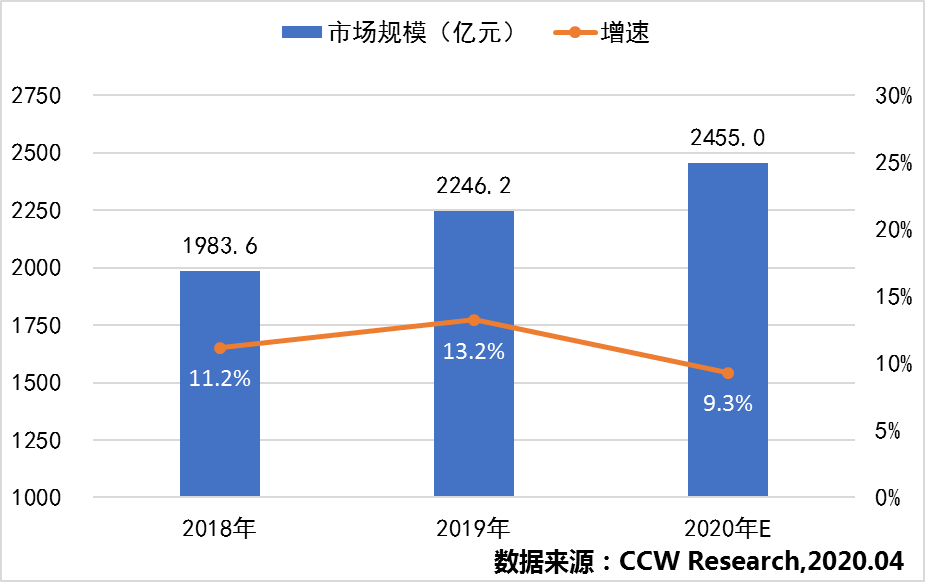 在数字化转型方面,巨大的行业用户将产生海量的需求。将根据计世资讯(CCW Research)《2019-2020年中国重点行业数字化转型市场现状与发展趋势研究报告》的研究结果表明,2019年中国制造行业数字化转型整体规模为2246.2亿元。预计2020年受新冠肺炎疫情影响,中国大多数制造业企业因停工停产造成收入降低,制造业数字化转型增速将呈现下降趋势,预计同比增长9.3%,市场规模将达到2455亿元。