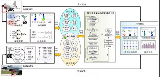 飞机总体设计是飞机研制的根基,现阶段的飞机优化设计仍存在变量耦合度高、数据缺乏、指标获取困难等问题。作为飞机重要的承力与操纵性部件,起落架承受着静态和动态的高负载,周而复始的工作更会对其结构产生破坏,如何实现对起落架的结构优化设计,对飞机的安全与可靠性有着重要意义。[3,4]如图5所示,北航团队与沈阳飞机工业集团合作,以飞机起落架为例,参照数字孪生五维模型,探索了基于数字孪生的起落架载荷预测辅助优化设计方法。
