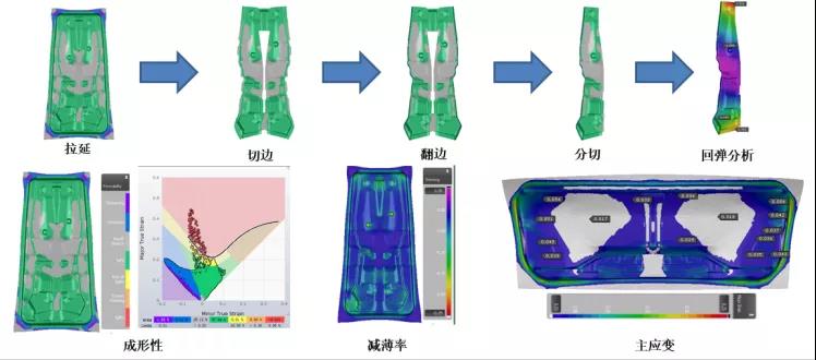 采用Autoform 软件,实现零件成型全工序分析,识别零件刚度、滑移线、冲击线、回弹等问题,并针对性的提出解决方案,确保零件质量满足要求,减少后期模具调试周期。