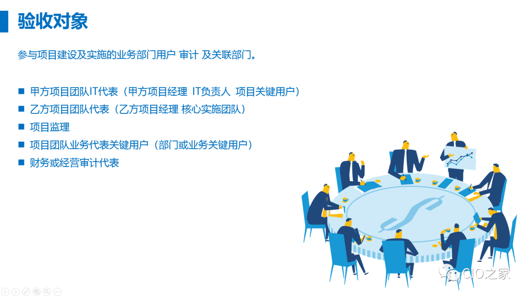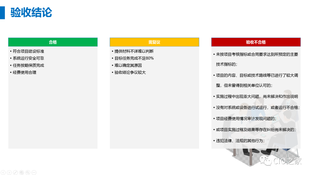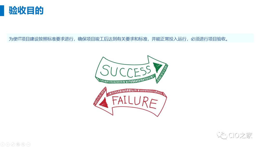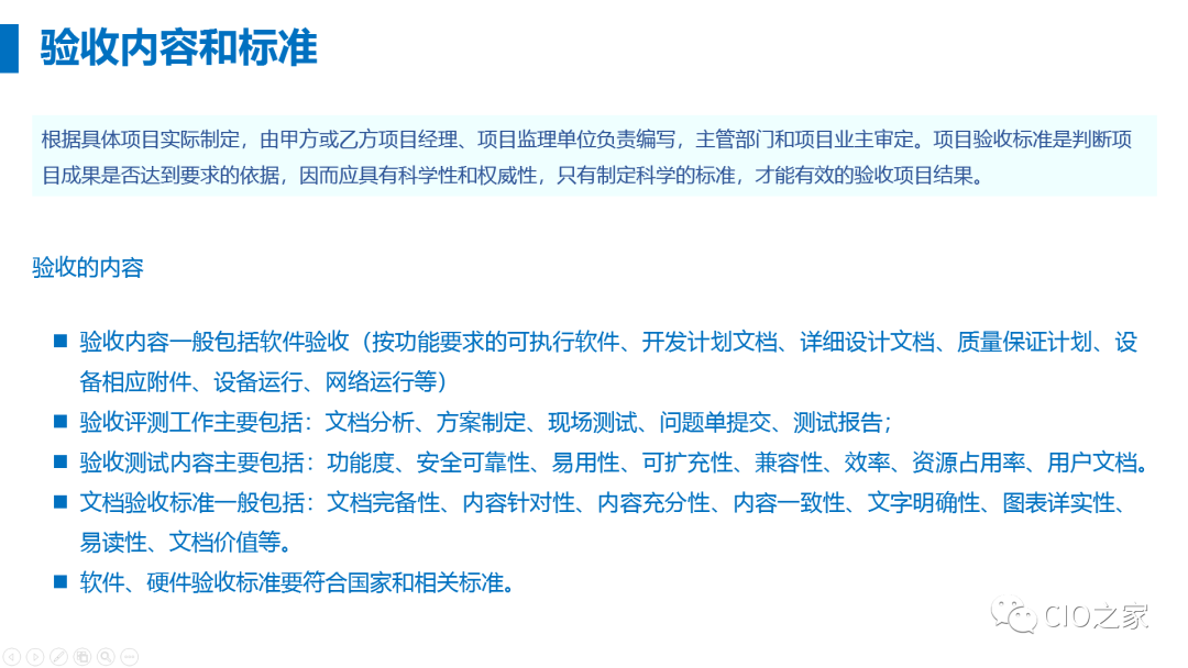 CIO把握、核检IT项目验收的主要过程,并不表示万事大吉,尚需对以下几大事项高度重视,加以解决,以保证项目和验收全面顺利完成。1、依据行业标准制定验收规则验收是目前或许是一个比较模糊的概念,业内一直都没有一个统一的标准,随意性大。而这种"验收的随意性"对于用户单位来说将是一个致命性的错误,产生此类问题的根源就在于CIO常不知道或根本就没有制定合理的验收标准,从而导致IT项目在验收过程中,主次颠倒,忽视了对关键业务流程的验收。因此,只有明确了相关系统项目的验收标准,才会做到有备而来,从而达到验收的目的。CIO一定要重新明确、制定每个阶段验收标准和项目总体验收标准,时刻维护验收的严谨性、权威性和准确性,必要时可请第三方咨询顾问机构来帮忙把脉把关。2、把握验收的时间火候一般而言,要根据软件模块的多少、系统涉及部门人员、投入费用的多少,CIO要在验收时间上进行更多考量、把控,别急于收尾验收。