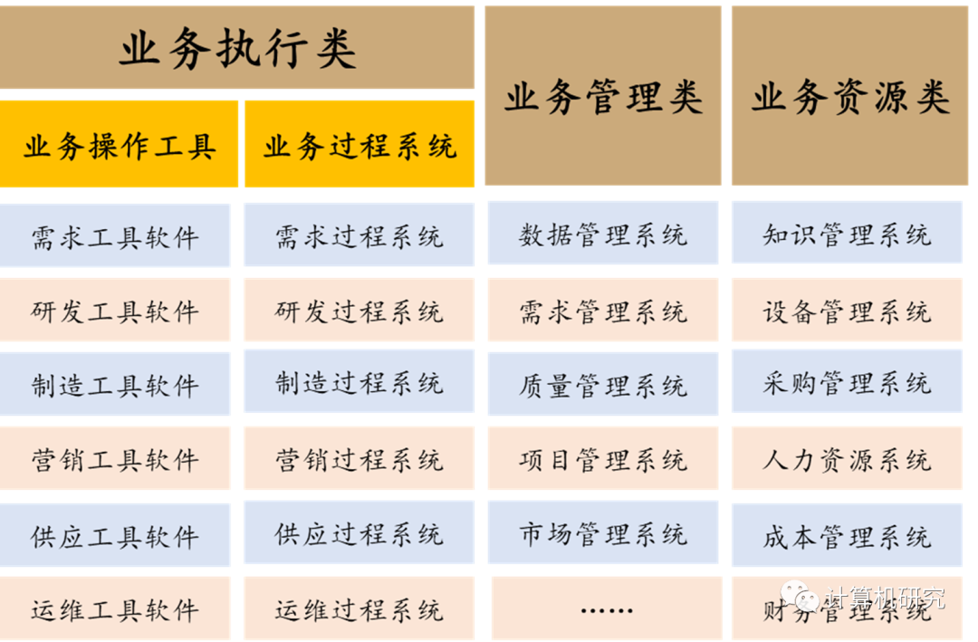 2)工信部运行局的分类方法,包括:产品研发设计类软件、生产控制类软件、业务管理类软件。