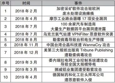 据国家工信安全中心统计,2017—2018年,工业领域公开报道的勒索病毒攻击事件高达17起,其中制造业是攻击的重点目标。而据《2018年数据泄露调查报告》统计,全球制造业的数据泄露事件多达536起,行业排名第6,其中涉及大型企业事件375起,行业排名居首位。随着工业企业价值密度增大、网络依赖性提升,将愈发成为勒索者的“理想目标”。表1列举了2018—2019年工业信息安全十大事件。