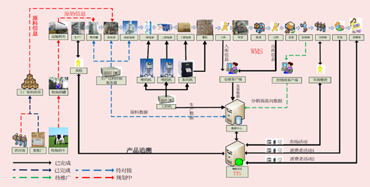 内蒙伊利集团是目前中国规模最大、产品线最全的乳制品企业。伊利为了保证乳品质量,在乳品生产中通过应用先进技术,保证质量安全可追溯。通过相关环节物料的信息化记录来溯源产品的整个生产加工过程,并延伸至供应链管理与销售终端客户。该体系可清晰记录整个供应链中涉及的物料品质信息、 流向信息、工艺信息等,一旦发现问题可以快速召回和追溯。产品信息追溯系统整体架构涉及生产链条的各个环节,如图2所示。伊利通过应用数字化技术使原料采集和生产过程改善(进化),从而达到保证质量的目的。